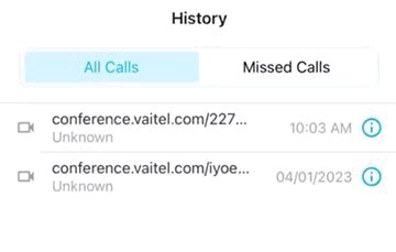 The History page tracks all calls, missed calls, and video conferences on your app.