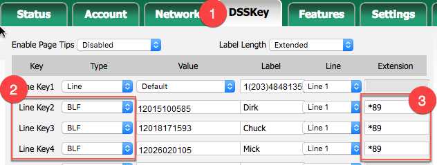 - For Directed Group Pickup, set each BLF number’s Extension column to *89.