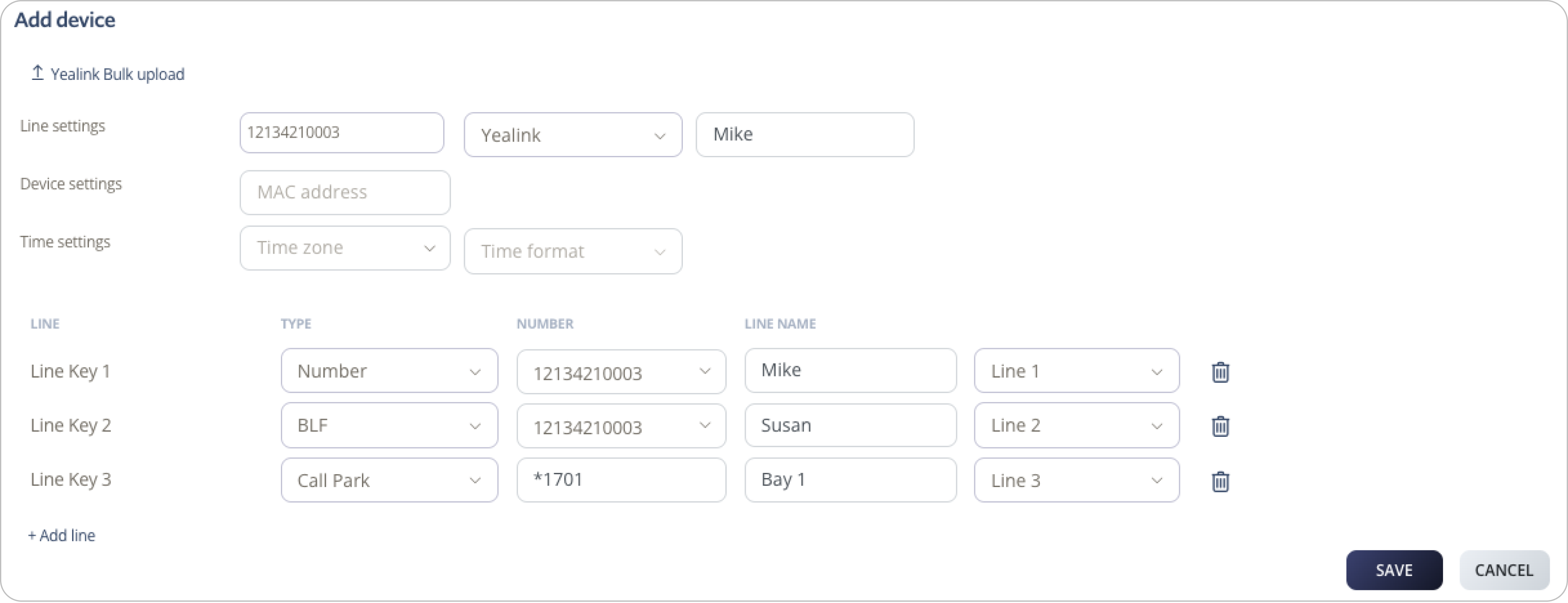 - Configure Line Settings: select the phone number, select Yealink, and enter a device name.