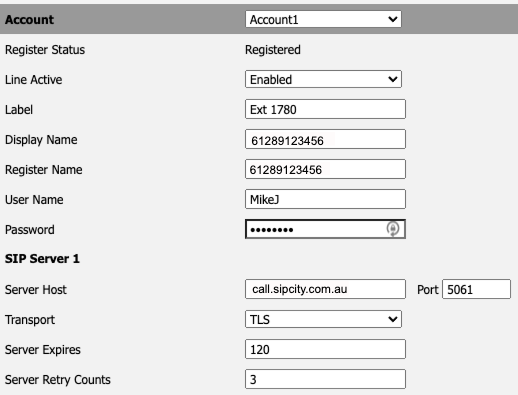 Select the Account tab (use an unused account if Account 1 is in use), then set the following fields:
