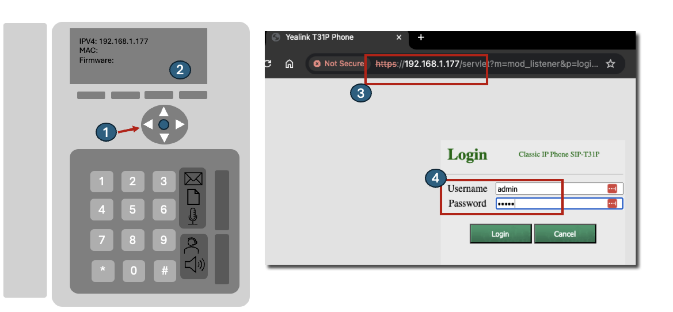 - On the Yealink phone, press the OK button (right of keypad) to display the phone’s IP address.