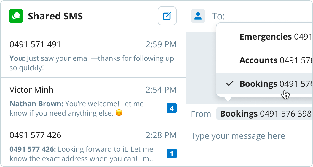Reply to customers together using a shared mobile number—so nothing gets missed and everyone stays in sync.