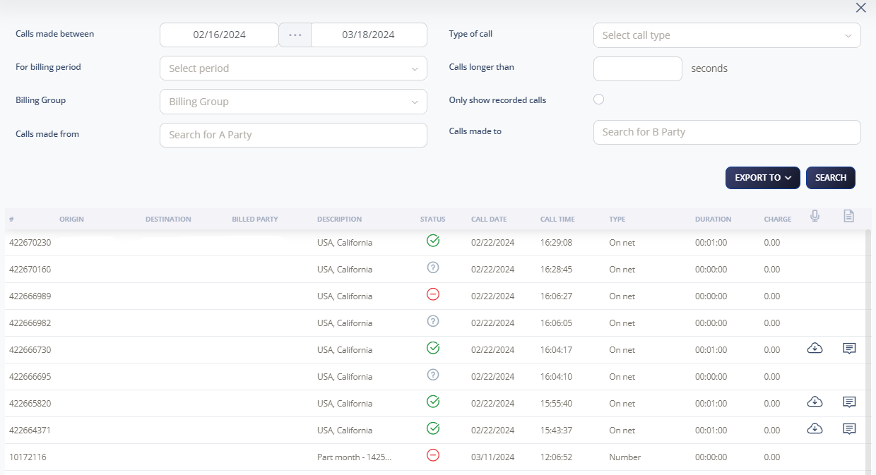 Search your Call Data Records (CDR) and billing records, refining your search by date, billing period, length, and call type.