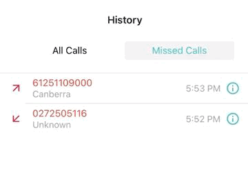Note: Missed calls are shown in red. Check the arrow next to the number or tap the details icon to determine whether the missed call was inbound or outbound.