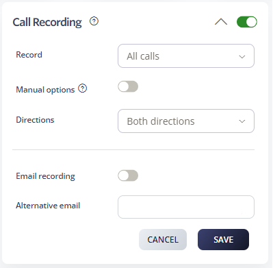 Directions: Choose which calls to record: both directions, outbound only, or inbound only.