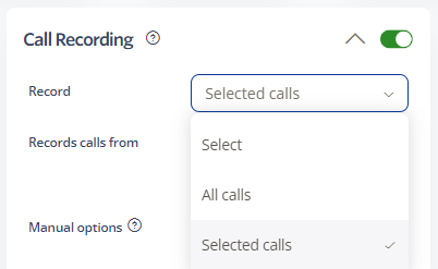 Selected calls: Record only specific calls based on criteria you set. You must specify the number(s) to record.