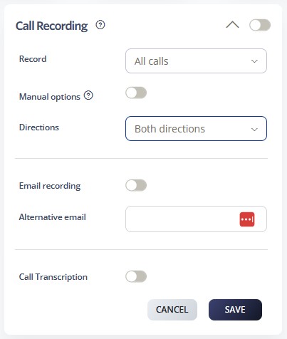 compliance, training, and legal documentation. Options include recording all calls or specific call types, with configurable storage and email delivery to align with organizational policies.