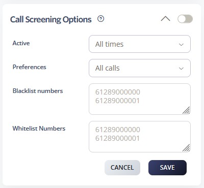- Blacklist Numbers: Specify numbers that are not permitted to contact you. This list functions in addition to numbers automatically blocked under your rejection settings.