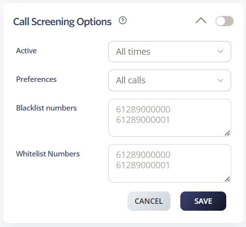 Add specific numbers that you do not want to receive calls from. These numbers will be blocked in addition to numbers blacklisted by your screening settings.