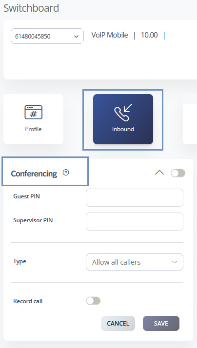 First, log in to the SIPcity portal. Then, navigate to SwitchBoard | Inbound | Conferencing section.